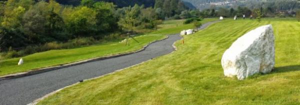 Dopo aver messo in sagoma il sottofondo dell’area verde, e stato steso uno strato di terreno vegetale per dare un piano rifinito per l’attechimento del manto erboso.Al centro di tutta l’area verde, e stata realizzata con una stradina profilata con traversine ferroviarie in legno bonificato.